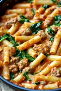 Ein schnelles und einfaches One-Pot-Rezept für cremige Pasta mit italienischer Wurst, Spinat und einer köstlichen Marinara-Sahne-Sauce. Perfekt für stressige Abende!