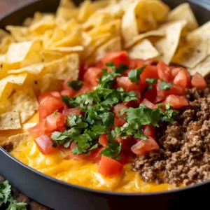 Die gehackte Roma-Tomate ist dann das i-Tüpfelchen. Sie bringt eine fruchtige Säure und eine schöne Farbe ins Spiel. Stell dir vor, wie die leuchtend roten Tomatenstückchen auf dem goldenen Käse Hackfleisch Dip liegen – ein Traum! Serviere den Dip am besten warm, direkt aus dem Ofen, mit knusprigen Tortilla-Chips. Oder probier mal Baguette-Scheiben oder Gemüsesticks dazu, das passt auch super. Für den nächsten Spieleabend ist das der absolute Hit, da bin ich mir sicher.