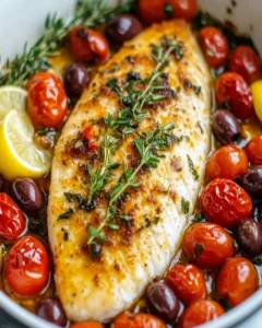 Ein einfaches und leckeres Rezept für gebackenen Fisch mit Kirschtomaten und Oliven, perfekt für ein schnelles, gesundes und mediterranes Gericht.