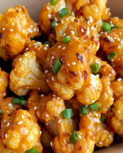 6. Servieren: Nimm den knusprigen Blumenkohl aus dem Ofen. Gib ihn in eine große Schüssel, gieße die Bang Bang Soße darüber und vermische alles gut. Sofort heiß servieren und genießen!
