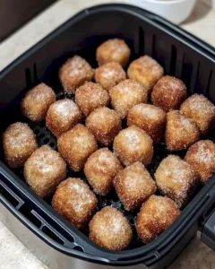 5. Bissen frittieren: Lege die Teigbällchen in einer einzigen Schicht in den Korb, achte darauf, dass sie sich nicht berühren. Frittiere sie für 5-7 Minuten und schüttle den Korb nach der Hälfte der Zeit einmal durch. Die Bissen sind fertig, wenn sie goldbraun und aufgegangen sind.