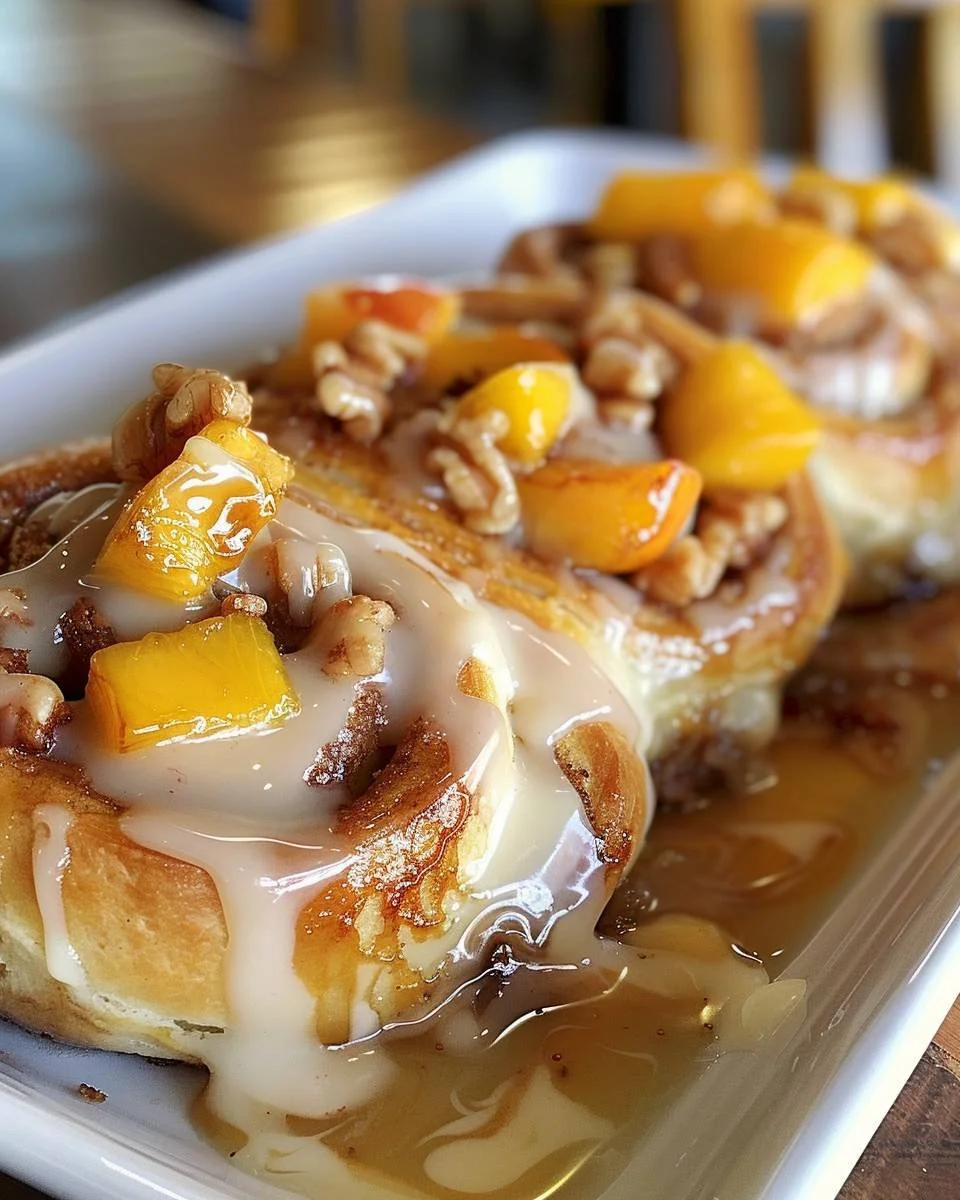 A delightful combination of sweet, juicy peaches and fluffy cinnamon rolls, perfect for summer. This cobbler is irresistible and ideal as a dessert for a picnic or with coffee.